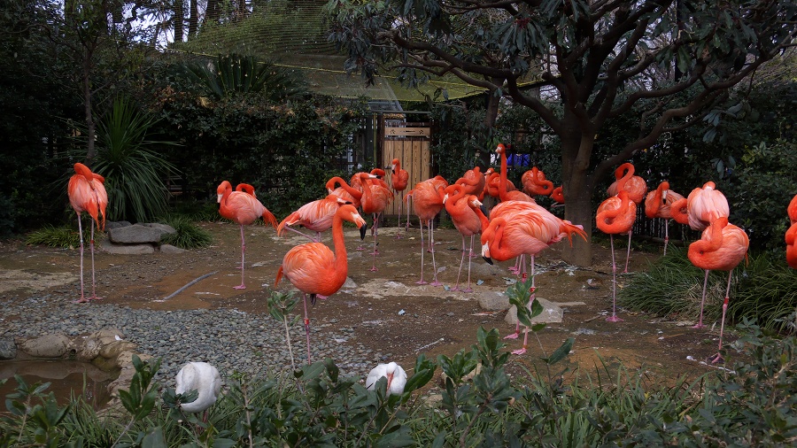 「フラミンゴ」 淡いピンク色〜鮮やかな紅色の体色は、餌である藍藻類の色素による。 撮影:2007年1月7日 / 上野動物園