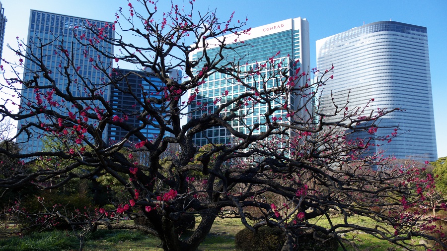 「紅梅と汐留高層ビル群」 撮影:2007年2月11日 / 浜離宮恩賜庭園